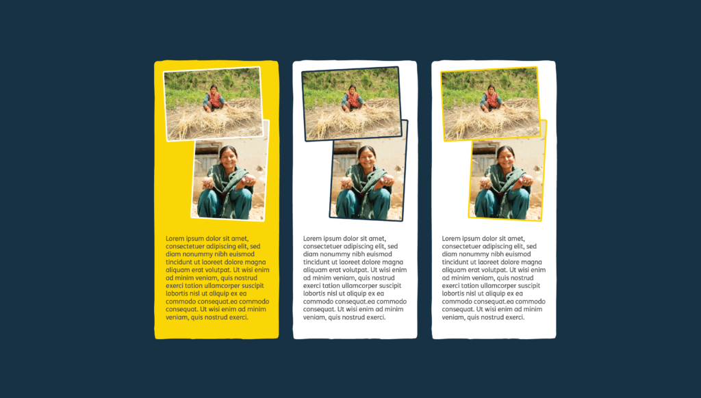 To help our images stand out, we can frame them subtly in yellow, white, or navy. These frames can be an alternative visual treatment for lower-quality, snapshot-style images.